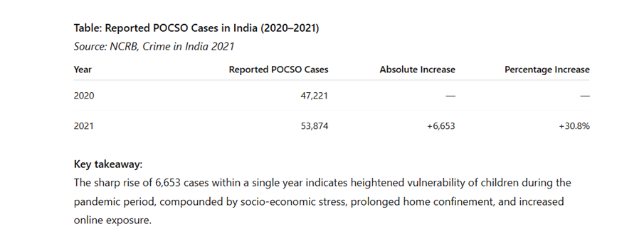 According to NCRB data, there has been a consistent increase in crimes against children, with over 1.6 lakh cases reported each year in recent years, a sizable percentage of which are covered under the POCSO Act. This increase is attributed to both a rise in incidence and improved reporting, which is facilitated by laws mandating reporting and heightened awareness. The fact that 94–96% of offenders are known to the child—typically through relatives, neighbours, or acquaintances—is a crucial finding from
