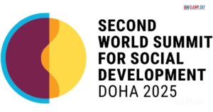 The Qatar National Convention Centre illuminated during the 2025 World Summit for Social Development in Doha, where world leaders discuss global poverty reduction, social inclusion, and sustainable development.