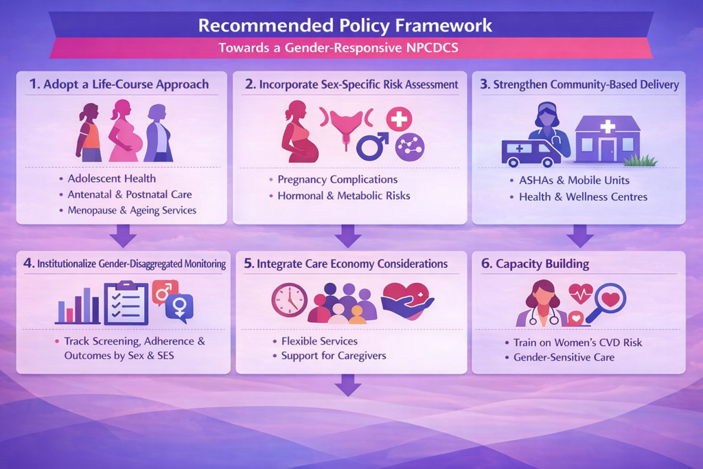 To advance gender-responsive NCD care, the Government of India should prioritise the establishment of dedicated Women’s NCD Health Units within primary healthcare systems to enable focused screening, early detection, and management. Strengthening alignment between the NPCDCS, Ayushman Bharat, and RMNCH+A is essential to ensure integrated and continuum-based service delivery across