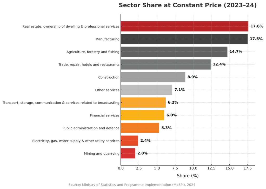 The character of India’s growth is changing too. Agriculture now accounts for only about 15% of GDP, even though roughly half the workforce lives off the land. By contrast, services now generate more than half of GDP, led by IT, finance, and retail. Industry (manufacturing, construction, etc.) contributes the rest. The shift is visible in recent numbers. In FY2023–24, farm output grew only about 1.4%, barely keeping