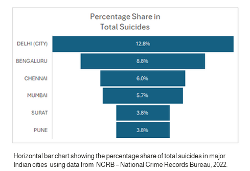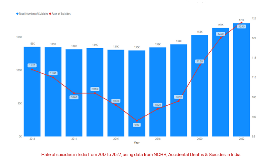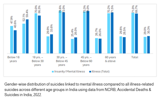 In India, Suicide rates have been rising. Over a decade, NCRB data shows a decline in suicide cases till 2017, but it increased from 10 per lakh in 2017 to 12.4 per lakh in 2022. Mental illness was the fourth leading cause, contributing to “8.5% of all suicide cases.” Yet this might “understate” the problem. Among the Indian states, Karnataka, Madhya Pradesh, Maharashtra, Tamil Nadu, and Punjab are the top five states with the highest indices of suicide influenced by mental illness. Altogether, they constitute 52.7% of total suicides determined by mental illness. Further, among cities, the metropolitan cities, Delhi, Bengaluru, Chennai, Mumbai, and Pune are reported as the top 5 cities with a 37.1% share in total suicide cases reported in 2022. This highlights these “dream” cities’ impaired pressure on population. the Further, working people between the age group of 18-45 years are more prone to commit suicide due to insanity/mental illness, as it was at 1 rank among causes of suicide of people aged 18-45, while it is at rank 2 for people aged 45 and above. Further COVID-19 pandemic also had a major impact on individuals’ mental health, as people struggled to cope with “social isolation”, “loneliness”, and “sudden loss of lives and livelihoods”. st Even people who don’t have a mental health condition may still face challenges to their mental health.