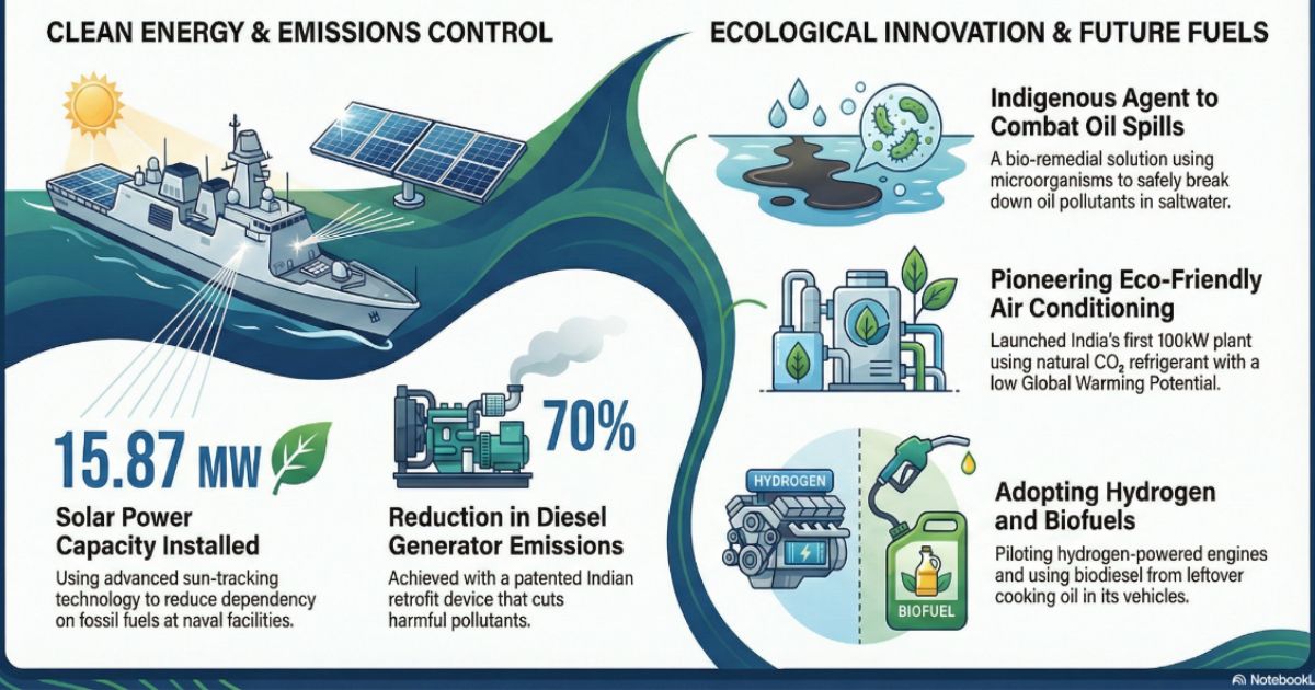 A significant component of the Navy’s initiative is the large-scale deployment of solar energy systems across its base. As part of the Government of India’s National Solar Mission (JNNSM), the Navy has already put into service solar power plants. It has a combined capacity of 15.87 MW. These state-of-the-art installations use single-axis sun-tracking technology. They have also computerised monitoring and control systems to ensure optimal performance. Additionally, 16 MW of Solar Photovoltaic (SPV) capacity is being built. This development reflects a long-term effort to maximise sustainable energy utilisation, reduce dependency on fossil fuels, and increase energy security within naval facilities.