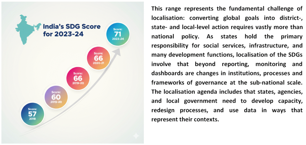 The journey towards the SDGs in India is not one steady upward slope. It is a patchwork of state-and district-level stories shaped by local governance, local capacities, local resources and local context. The upward trend in national averages is positive; the regional states play a role in localising. States that embed the SDGs in local structures, and local budgets and local accountability systems are demonstrating forward movement, states that depend on old structures are at risk of inertia. To realize India’s 2030 ambitions, the localisation of the SDGs needs to be a part of a continuum of state reform that considers each local body, and community, together with each district contextualising the national reform agenda. The evidence shows: localisation works. The challenge is scaling up equally.