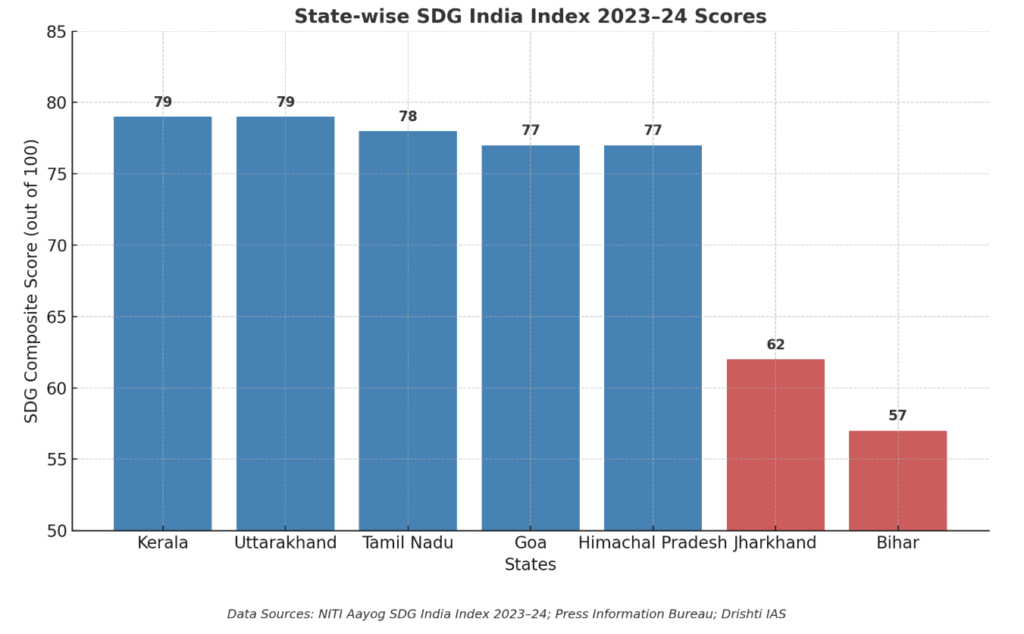 At the top of the scoreboard for 2023-2024 are states like Kerala and Uttarakhand (both scoring 79), followed by Tamil Nadu (78), Goa (77) and Himachal Pradesh (77) (gfst.in). These states show consistently that localisation is “working”: they have taken SDG goals, objectives and targets into state policy, monitoring systems and coordination between departments. For example, Kerala’s ongoing investments in health system, education system and social infrastructure provide a strong platform for monitoring multiple SDG domains at once. Therefore, based on outcome success, a central lesson is that when localisation is part of the state governance structure, outcomes will be improved.