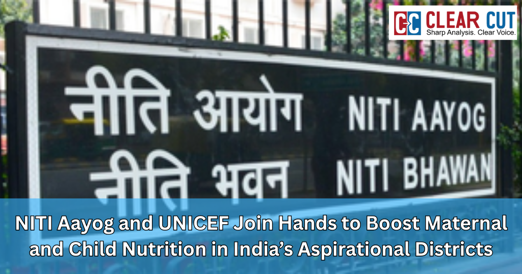 NITI Aayog and UNICEF have partnered to improve maternal and child nutrition in India’s Aspirational Districts and Blocks through better healthcare delivery, awareness campaigns, and CSR-funded nutrition initiatives. The collaboration will also strengthen Anganwadi infrastructure, enhance ICDS services, and build the capacity of frontline workers to improve nutrition outcomes in underserved regions.