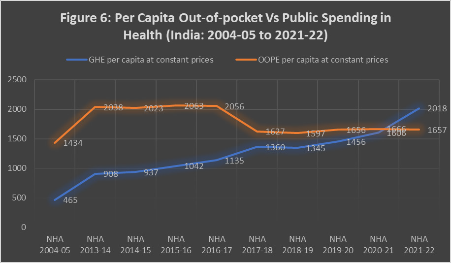 provement in this trend. According to the National Health Accounts, the share of out-of-pocket expenditure in total health spending declined from 69.4 percent in 2004–05 to 39.4 percent in 2021–22. This decline reflects increased public investment in healthcare, the expansion of government health programmes such as Ayushman Bharat, and the strengthening of primary healthcare through Health and Wellness Centres.