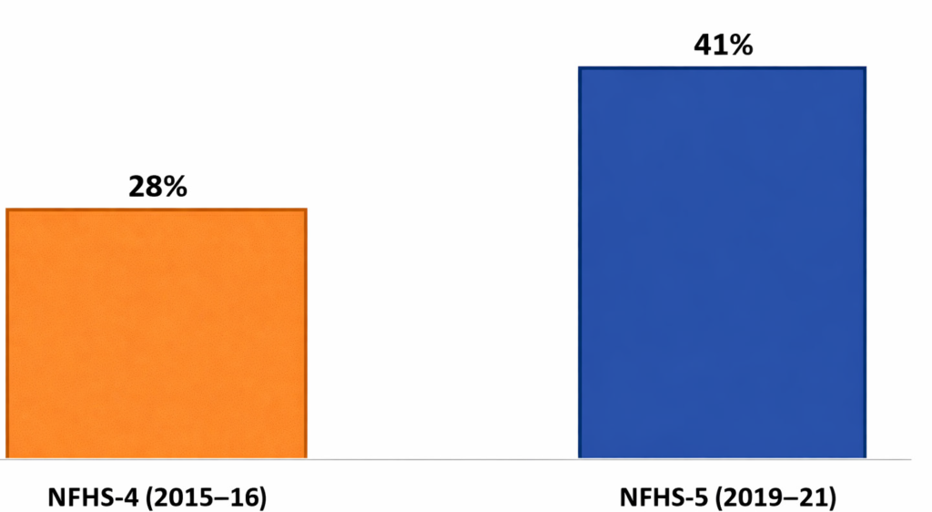 Survey indicate a steady rise in coverage, from 28% of the population in NFHS-4 (2015–16) to 41% in NFHS-5 (2019–21). Government initiatives have been central to this expansion, particularly Ayushman Bharat – Pradhan Mantri Jan Arogya Yojana (PM-JAY), launched in 2018. Several states have also introduced their own insurance programmes, including Aarogyasri in Telangana and Andhra Pradesh, the Chief Minister’s Comprehensive Health Insurance Scheme in Tamil Nadu, and Bhamashah Swasthya Bima Yojana in Rajasthan.Despite the expansion of coverage, the reduction in out-of-pocket expenditure remains limited. Most insurance schemes primarily cover hospitalisation, while a substantial share of household healthcare spending in India occurs on outpatient care and medicines, which are often not fully covered by insurance programmes.
