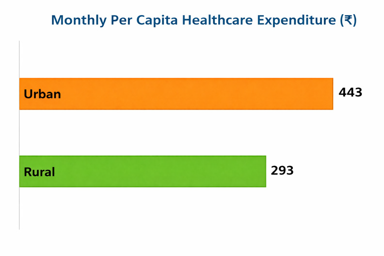 High out-of-pocket expenditure has significant socioeconomic implications for households in India. Healthcare spending constitutes an important component of household consumption expenditure and can impose considerable financial pressure, particularly among lower-income groups. According to the Household Consumption Expenditure Survey (HCES) 2022–23), the average monthly per capita expenditure on healthcare is ₹293 in rural areas and ₹443 in urban areas.