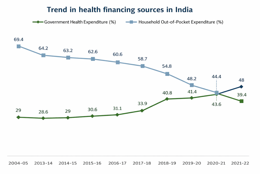For many years, India has been among the countries with the highest dependence on household spending for healthcare. Patients and families have traditionally borne a large share of medical expenses directly, making healthcare costs a major financial burden.
