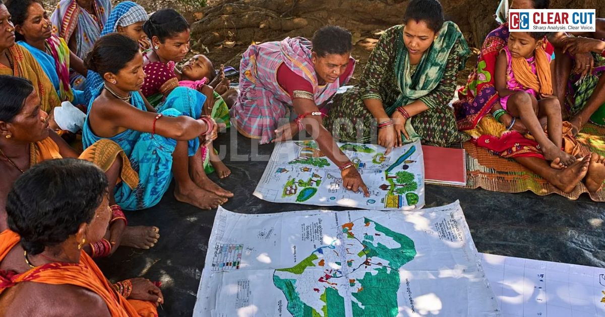 A group of women in the Koraput district of southern Odisha, gathered beneath the boughs of a neem tree with pieces of paper, colored pencils, and decades of lived experience. What they produce are not abstract diagrams but rich “dream maps”: green patches for forests, blue trails for streams, and fields with fruit trees. These are the lands that they once knew and still wish to reclaim.